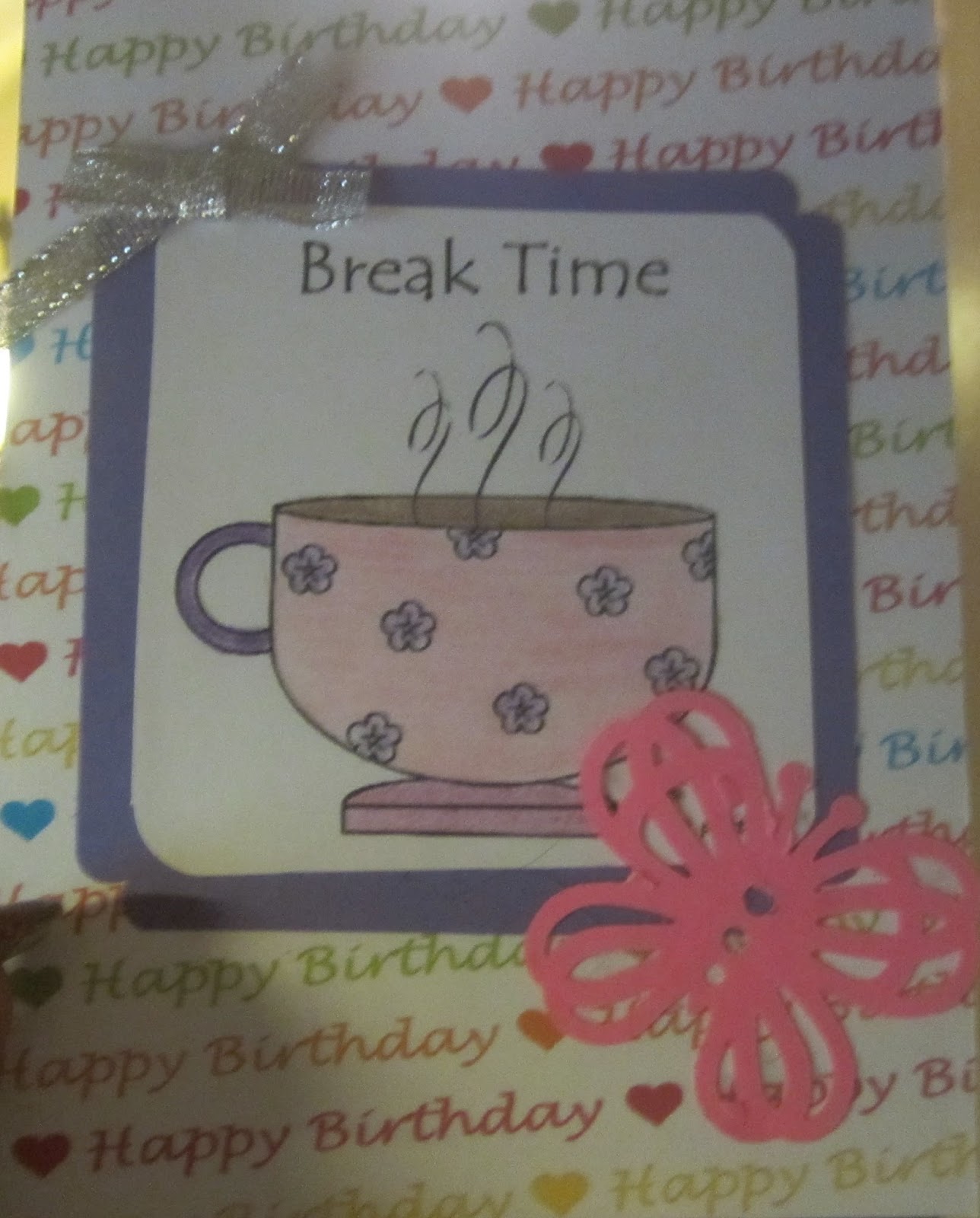 I used her freebie image Break time, colored with water color pencils added a bow and a die cut butterfly..