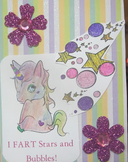 I used the progressive challenge image from Odd Ball art,and I used a Unicorn image. I colored with Prismacolor pencils and Glitter pens, I added the sentiment , glitter flowers and gems, Im entering the challenge here..https://www.facebook.com/groups/OddballArtStamps/